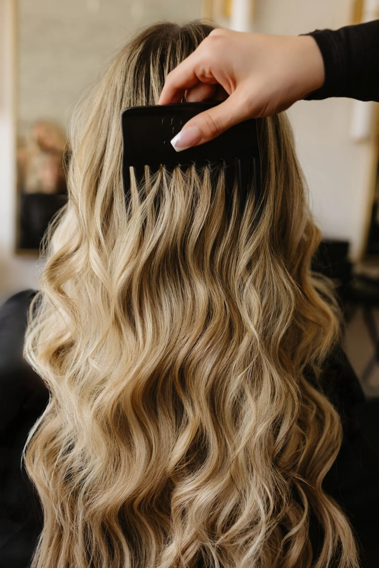 A person with long, wavy blonde hair having their hair combed or styled with a wide-tooth comb.